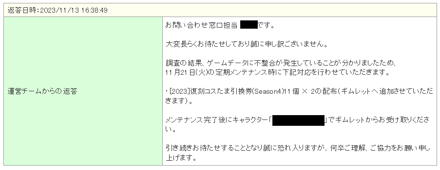 運営様にお礼を申し上げたかったけど、アイテム消失を報告したスレッドが閉められたので。